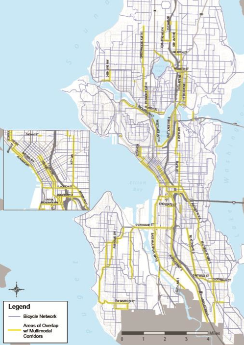 Map shows multi-modal corridors where bike plans overlap with transit/freight. The plan includes a framework for making sure all uses are preserved