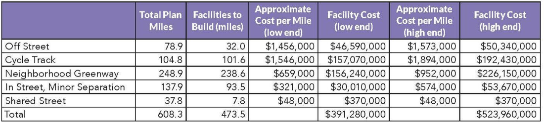 The raw total price tag for 474 miles of new and upgraded bike facilities clocks in between $391 million and $524 million. That estimate is full of caveats, though, and should not be taken at face value. It includes all elements of implementing the plan, including staff time and elements of projects geared toward the safety and access of other modes, such as improvements for people on foot. It also does not factor in the fact that SDOT’s biking and walking program has a great success rate at securing grants to assist with costs.