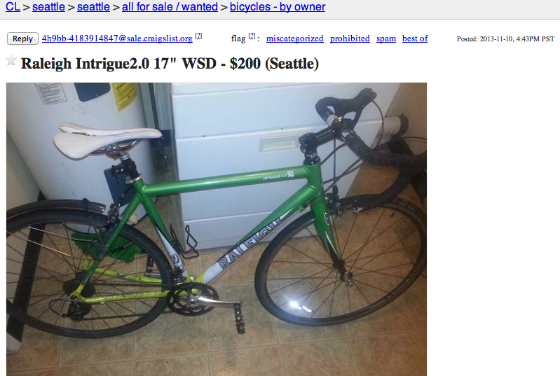 Frustrated and now on the verge of being late to work at one of her jobs, she ran to work. When she had the chance, she reported the theft to Seattle Police and emailed Seattle Bike Blog to ask what else she can do to get it back. That’s when she found her ride listed on — yep, you guessed it — Craigslist.
